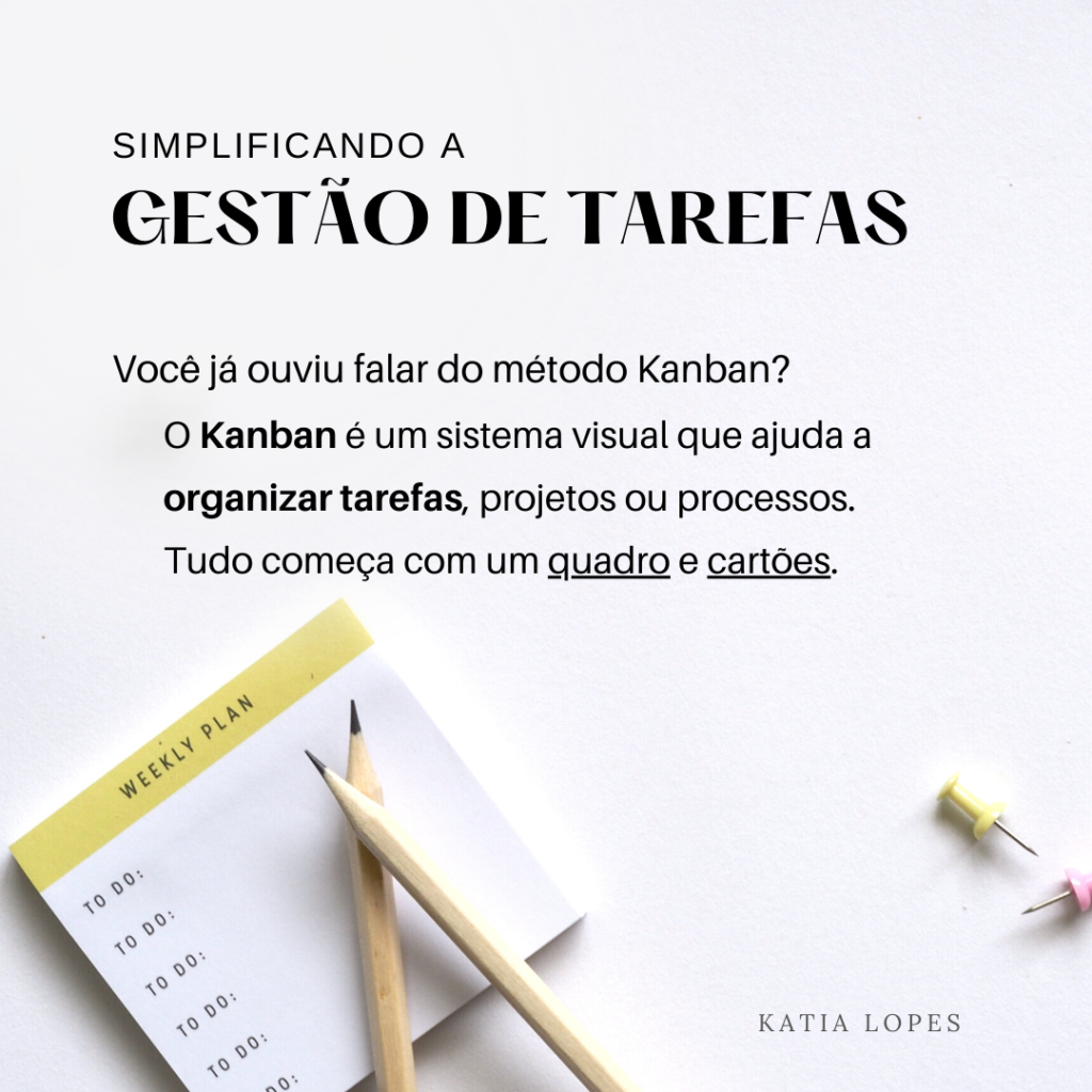 Você já ouviu falar do método Kanban? O Kanban é um sistema visual que ajuda a organizar tarefas, projetos ou processos. Tudo começa com um quadro e cartões. Material Necessário Se você preferir tecnologia, pode usar o aplicativo Trello Como funciona – Faça 3 colunas com os títulos: – Para Fazer – Fazendo – Feito– Nos post-its crie as tarefas a serem executadas e cole na primeira coluna (Para Fazer)– Move os post-it pelo quadro conforme as tarefas progridem Ao final do dia, o que foi feito pode retirar do quadro Com o Kanban, você tem uma visão clara do que precisa ser feito, o que está em andamento e o que já foi concluído. É como um mapa para o sucesso! Você pode usá-lo para gerenciar sua vida pessoal,usar para organizar as tarefas do seus filhos ou planejamento de eventos. Seja no trabalho ou na vida pessoal, o Kanban simplifica a gestão de tarefas e traz mais organização para o seu dia-a-dia! Experimente e veja a diferença. Se você precisa organizar a sua empresa digitalmente, entre em contato. Trabalho mapeando os problemas e criando processos e atuando no gerenciamento digital através de controles de clientes, faturamento, criação de propostas, administração de tarefas e organização digital contato@katialopess.com